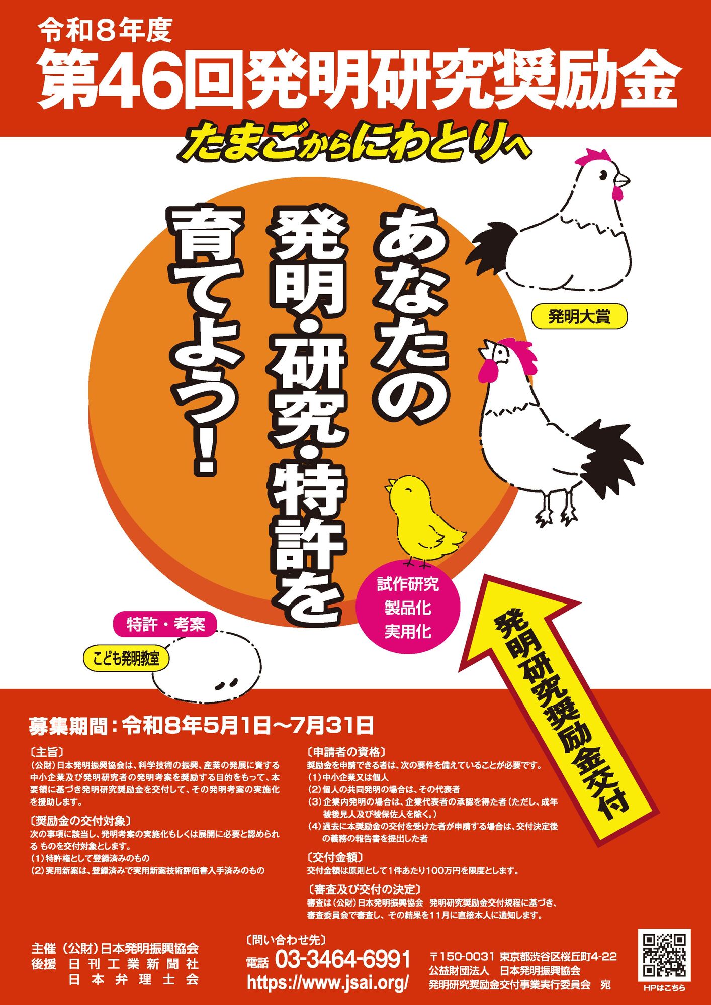 独創性に富む発明によって優秀な技術・製品を生み出した中堅・中小企業の方々及び個人を表彰し、その功績を広く一般に紹介し、発明の推進を図るため発明大賞表彰事業を実施しています。 発明大賞表彰事業は日刊工業新聞社との共催で推進しており、毎年1回定期的に募集し、応募者の中から厳正な審査を経て、発明大賞をはじめとする27件を表彰します。詳しくは、発明大賞表彰事業のページをご覧ください。 |